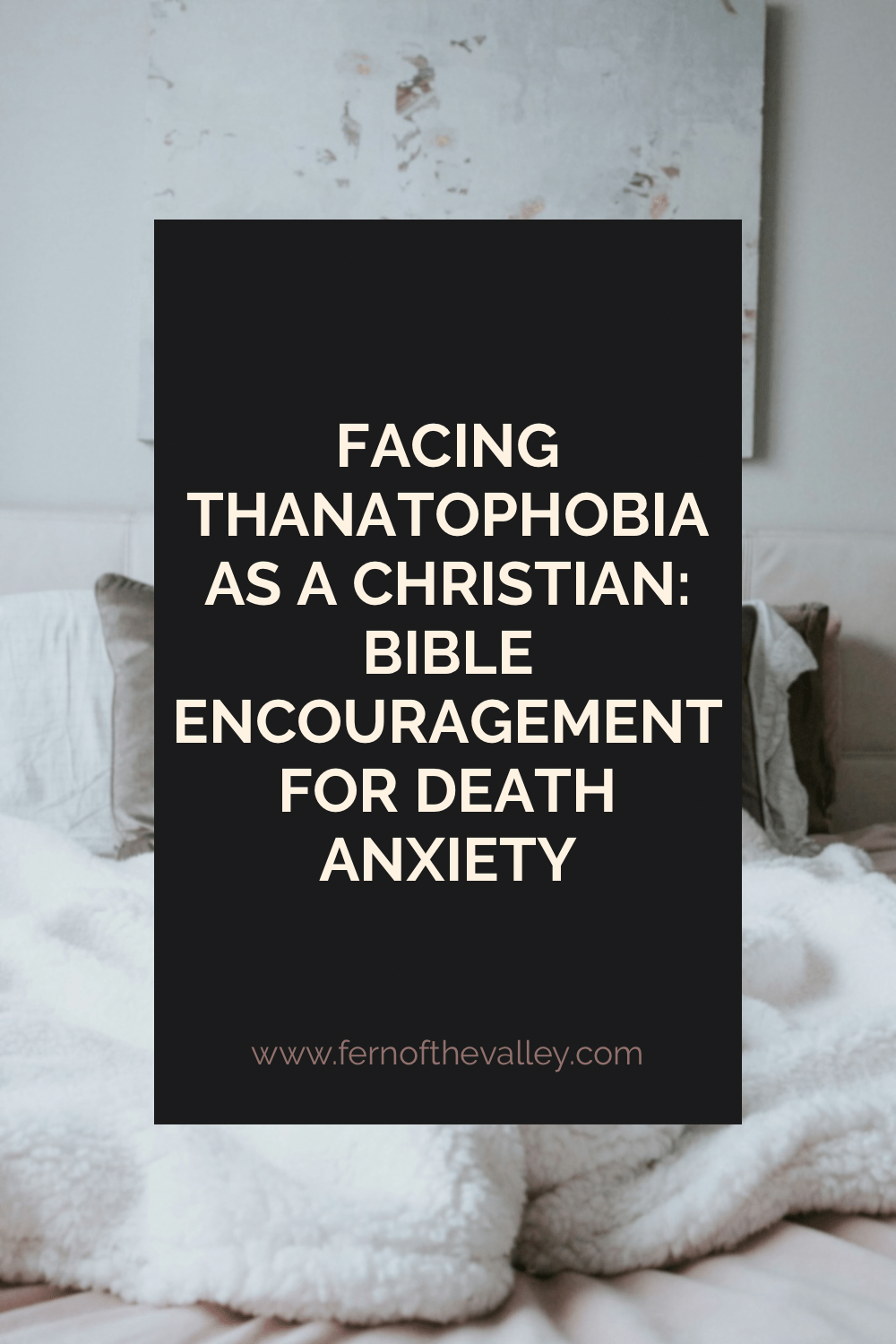 Fern of the Valley blog and shop banner in soft pink aesthetic, featuring a delicate fern illustration and text: “Christian Anxiety & Faith-Based Guidance.” Promotes gentle biblical encouragement for overcoming death anxiety, worry, and fear through faith, hope, and joy. Includes website www.fernofthevalley.com and social handles @fernofthevalley on Instagram, Pinterest, and YouTube.